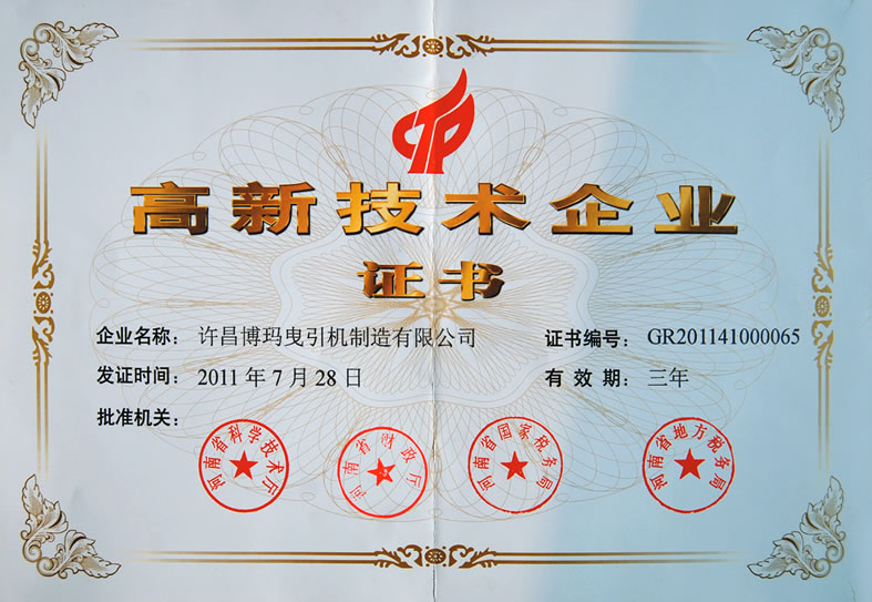 博瑪曳引機公司和威瑪德公司被列為“河南省高新技術企業”,這獎為促進西繼迅達的快速發展,推動企業做強做大,奠定堅實的基礎。