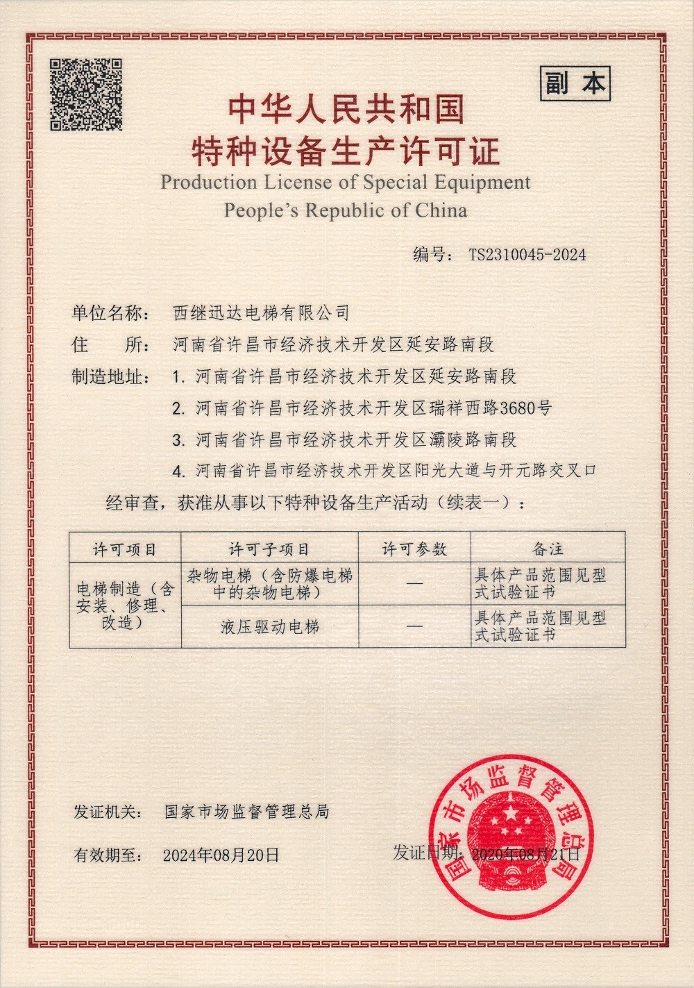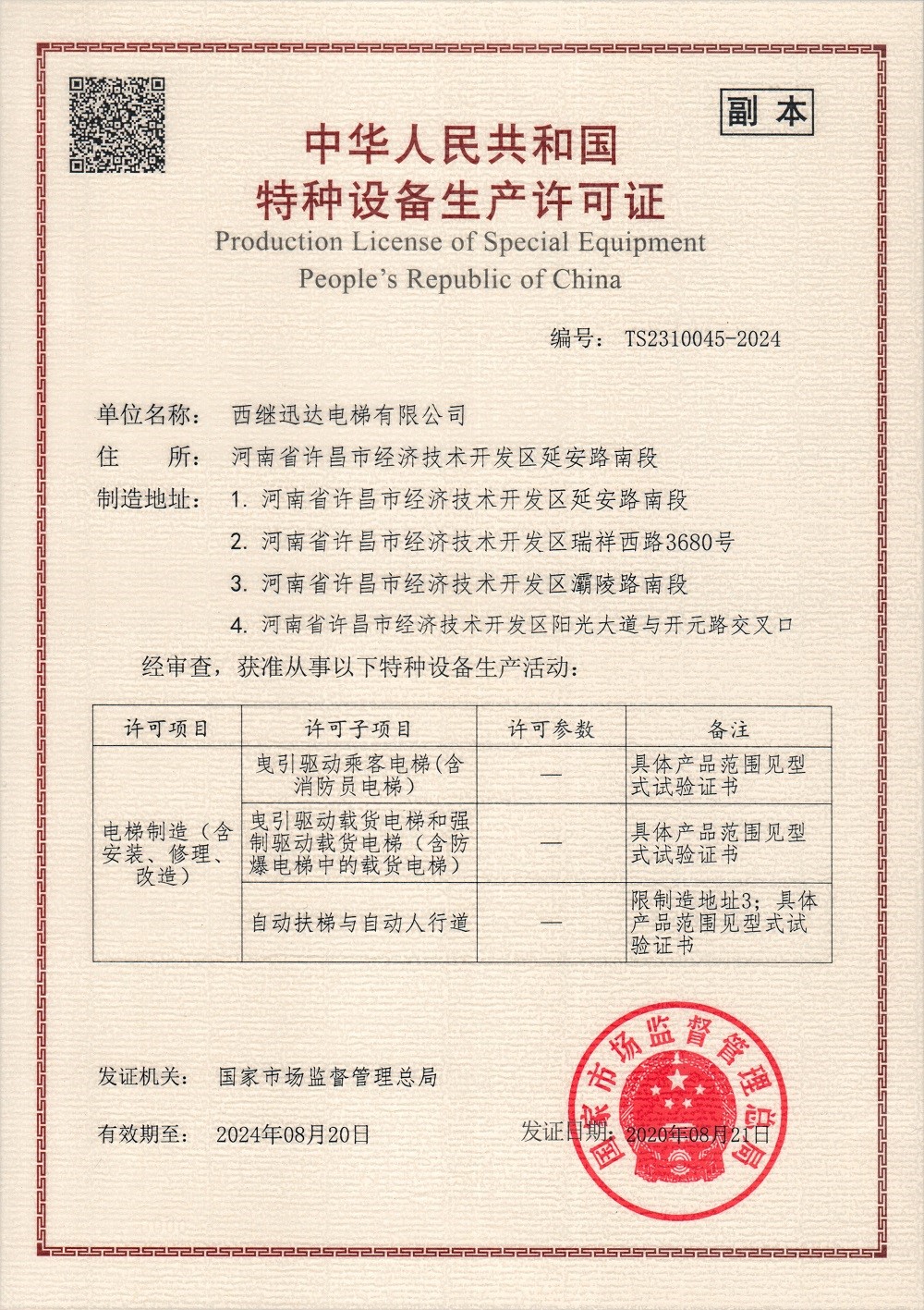 8月21日,國家市場監(jiān)督管理總局為西繼迅達電梯換發(fā)特種設備生產許可證。證書編號:TS2310045-2024,證書有效期至2024年8月20日。
