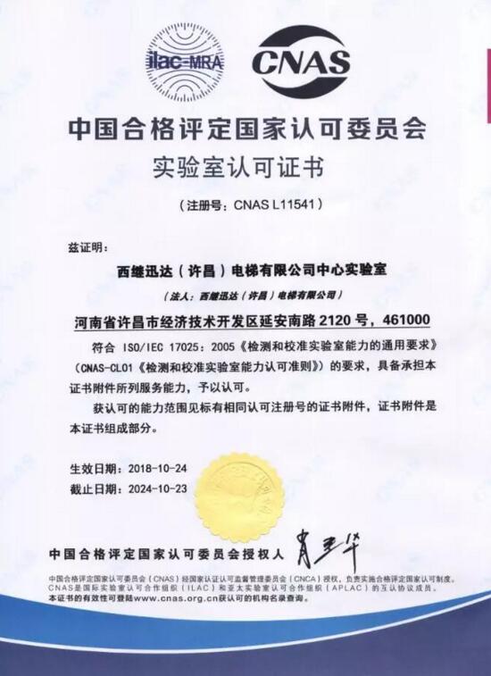 10月24日,西繼迅達電梯中心實驗室被中國合格評定國家認可委員會認定為國家認可實驗室,注冊編號為CNAS L11541,有效期6年。